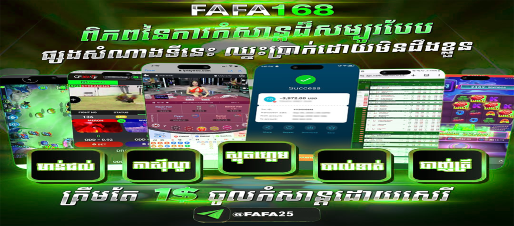 FAFA168 គឺជាវេទិកាកាស៊ីណូអនឡាញពេញនិយម ដែលផ្តល់ឱកាសឈ្នះប្រាក់ពិតដោយងាយៗ សម្រាប់អ្នកដែលចូលចិត្តផ្សងសំណាង។ នៅទីនេះ អ្នកអាចស្វែងរកហ្គេមជាច្រើនពីស្លុត បាការ៉ាត់ ដល់ហ្គេមបាល់ទាត់ មាន់ជល់ និងល្បែងផ្សេងៗទៀត ដែលមានទាំងសុវត្ថិភាព និងទាន់សម័យ។ ប្រព័ន្ធដាក់ប្រាក់ និងដកប្រាក់រហ័សអាចធ្វើបានដោយឆាប់រហ័ស និងងាយស្រួល ជាមួយការការពារទិន្នន័យដ៏មាំមួន។ គឺជាជម្រើសដ៏ល្អសម្រាប់អ្នកដែលចង់ទទួលបានអារម្មណ៍រំភើប និងឈ្នះប្រាក់ពិតដោយមិនដឹងខ្លួន។